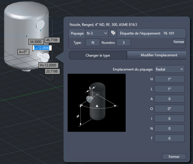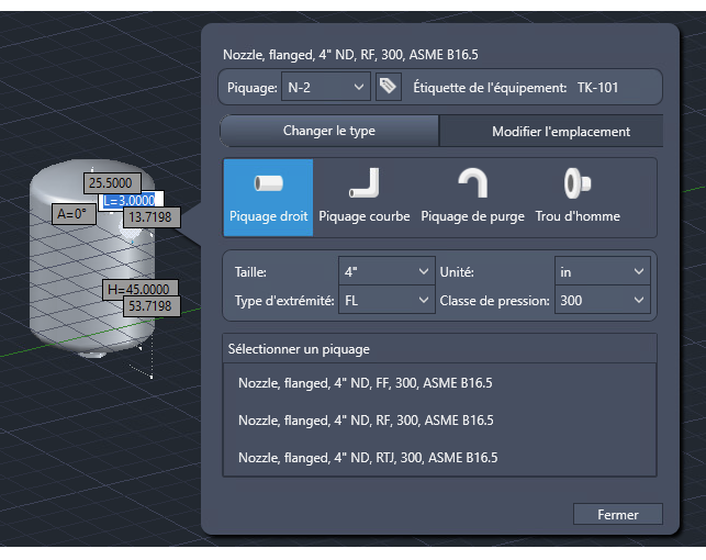 Qu’il s’agisse d’équipements fabriqués ou de solides 3D convertis, vous pouvez ajouter des piquages et en spécifier la position, la direction et les cotes.