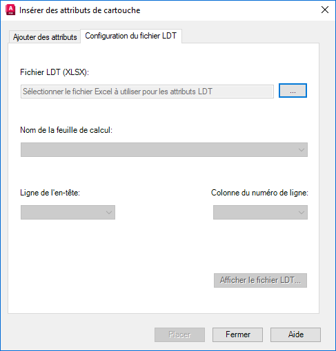 Dans la boîte de dialogue Insérer des attributs de cartouche, cliquez sur l'onglet Configuration du fichier LDT et effectuez les opérations suivantes :