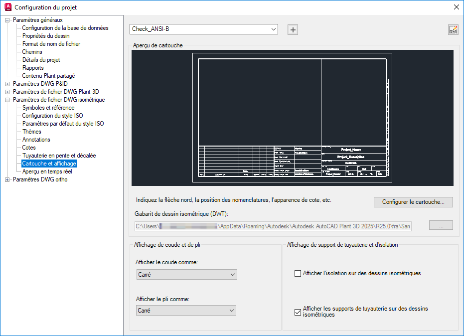 Dans l'arborescence Configuration de projet, développez Paramètres de fichier DWG isométrique. Cliquez sur Cartouche et affichage.