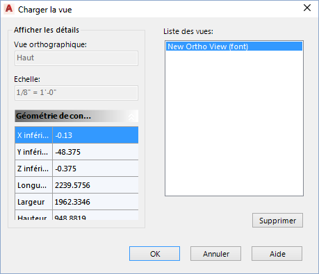 Affiche la liste des vues orthographiques enregistrées que vous pouvez charger dans le dessin temporaire. En cliquant deux fois sur le nom d'une liste, vous pouvez la renommer.