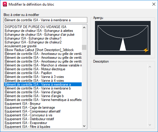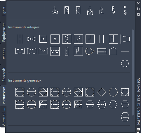- Les symboles d’instrumentation manquants spécifiés dans la norme ANSI/ISA-5.1-2022 ont été créés et inclus. Ces blocs de symboles ajoutés récemment sont précédés du préfixe « ISA » et se trouvent dans le fichier projSymbolStyle.dwg.