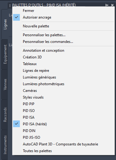 Vous pouvez continuer à utiliser les symboles ISA hérités même si vous choisissez de ne pas mettre à jour le contenu ISA. Sélectionnez l’option P&ID ISA (hérité) dans la palette d’outils pour continuer à utiliser les symboles ISA hérités dans votre projet.