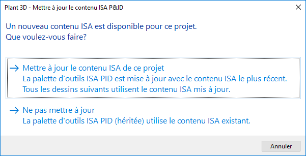 En outre, une vérification de la migration a été implémentée pour valider les projets ISA hérités lorsqu’ils sont ouverts. Lorsque vous ouvrez un projet ISA créé dans une version antérieure, le lien « Mise à jour ISA disponible » s’affiche sur le nœud Définitions de classe P&ID et sur chacune de ses pages enfant. Cliquez sur le lien pour ouvrir la boîte de dialogue Plant 3D - Mettre à jour le contenu ISA P&ID.