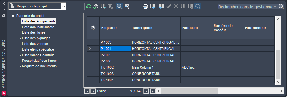 • Dans la liste déroulante du Gestionnaire de données, cliquez sur Rapports de projet.