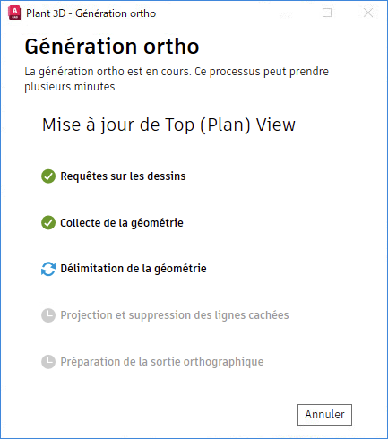 Pour des performances optimales, évitez d’effectuer d’autres opérations dans l’application pendant le processus de génération ortho. Pour arrêter le processus de génération ortho à tout moment, cliquez sur Annuler dans la boîte de dialogue Génération ortho.