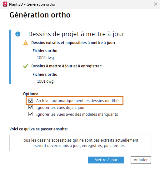 Pour les projets de collaboration, les dessins ortho extraits par d’autres utilisateurs ne peuvent pas être mis à jour. De plus, l’option Archiver automatiquement les dessins modifiés vous permet d’archiver automatiquement tous les dessins ortho concernés à la fin du processus de génération ortho.