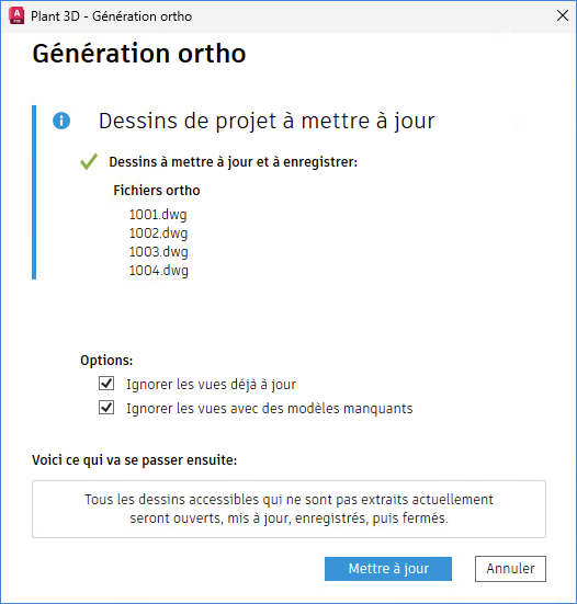 - Ignorer les vues déjà à jour : cette option ignore les vues déjà à jour lors de la génération ortho.