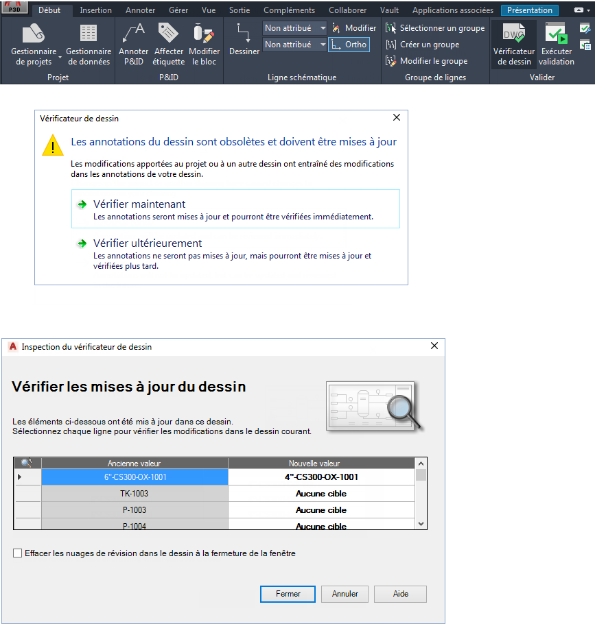 Le Vérificateur de dessin compare l'ensemble du texte et des annotations dans le dessin P&ID avec les propriétés du projet courant afin de rechercher les incohérences résultant des modifications récentes apportées en dehors du dessin. Il identifie les mises à jour du dessin courant.