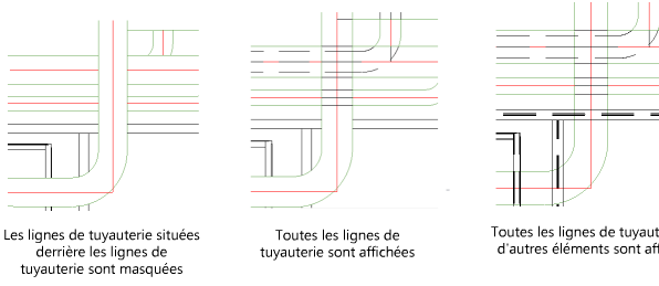 Toutes les lignes de tuyauterie et d'autres objets situés derrière des tuyaux ou des objets sont affichés.