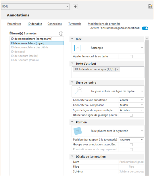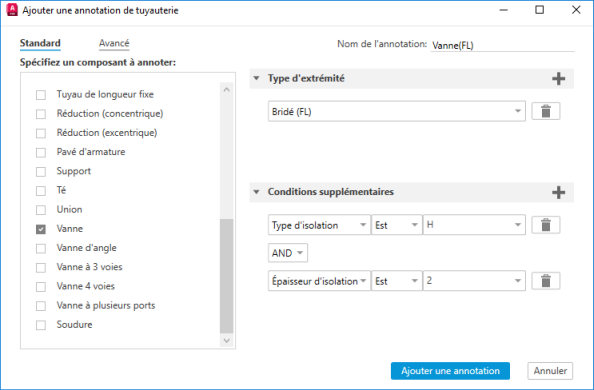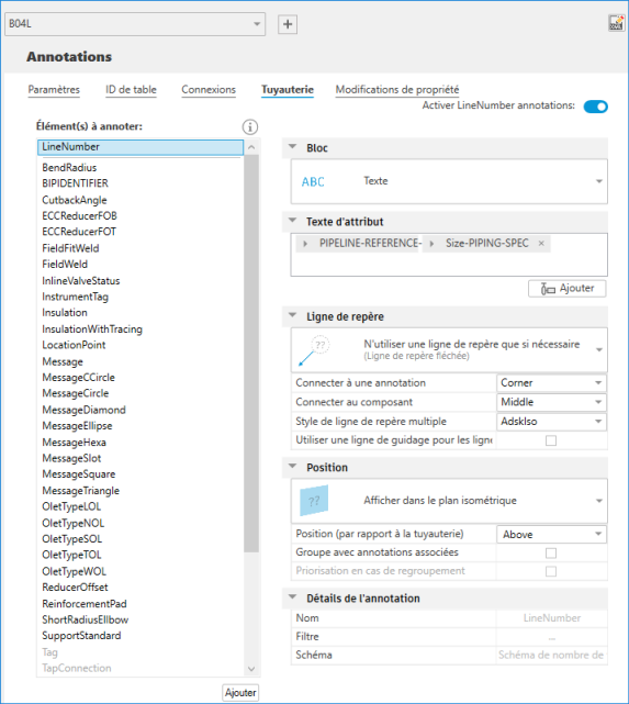 - Au bas de la liste Éléments à annoter, cliquez sur Ajouter pour ajouter une nouvelle annotation de tuyauterie.
