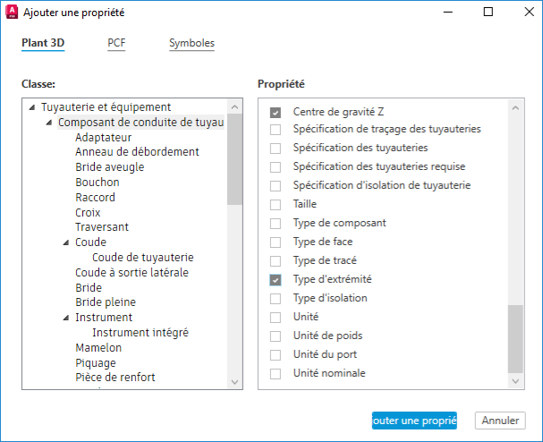- Choisir les propriétés dans Plant 3D ou PCF.