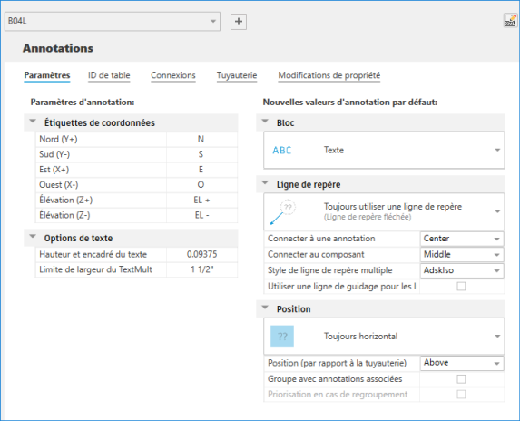 - Spécifier les paramètres par défaut des nouvelles annotations, tels que le bloc, les styles de ligne de repère, la position et d’autres paramètres associés.