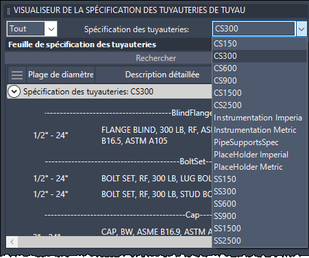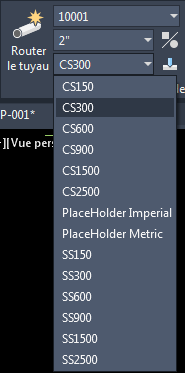 Dans la liste déroulante, cliquez sur une spécification des tuyauteries (p. ex. CS300).