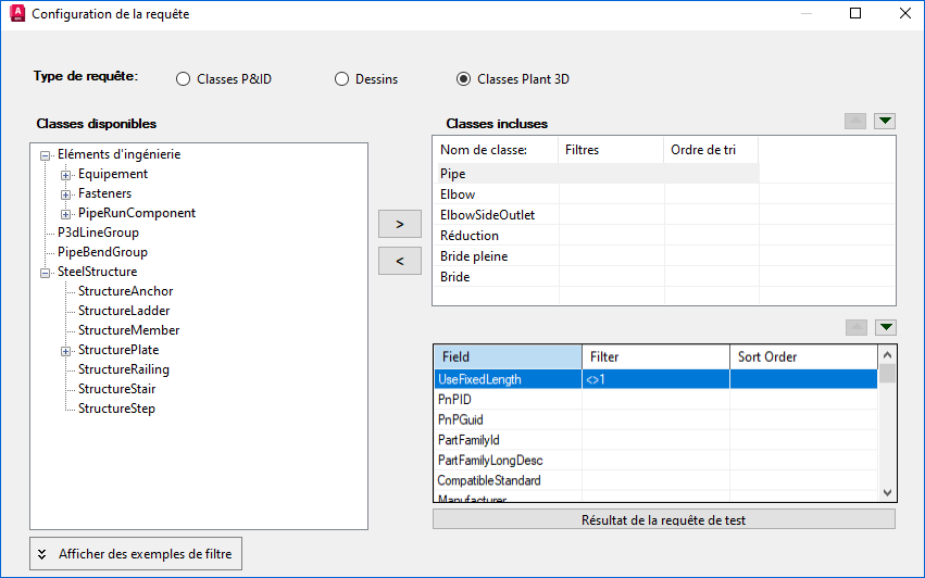 - Dans le champ Type de requête, cliquez sur Classes P&ID, Dessins ou Classes Plant 3D.