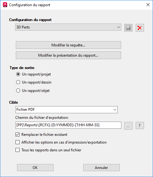 - Dans la boîte de dialogue Configuration du rapport, sous Configuration du rapport, effectuez les opérations suivantes :