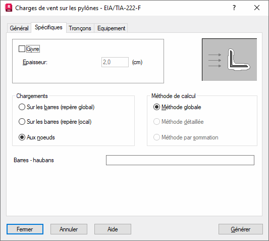 Remarque : Il s'agit de l'épaisseur de la couche. Dans les calculs, la dimension transversale au vent augmente de deux fois la valeur de l'épaisseur de givre spécifiée.