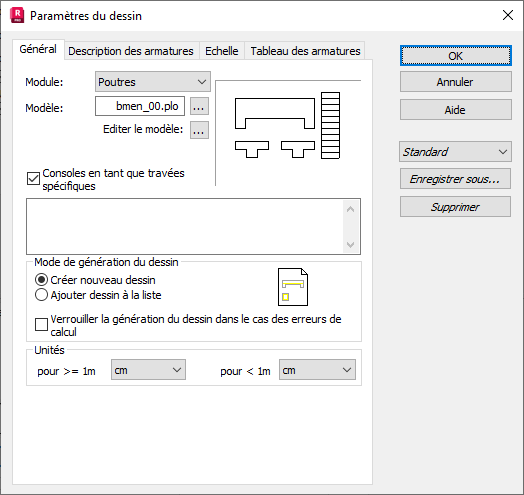 Si vous sélectionnez le premier mode (Créer nouveau), après l'activation du dessin, seulement le dessin d'un élément béton donné ou la liste d'éléments sont affichés. Chaque réactivation du dessin supprime le dessin précédent.