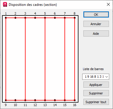 Pour définir la forme et l'organisation des armatures transversales, cliquez sur les barres longitudinales consécutives ; la forme des armatures transversales est définie ainsi. Les formes définies doivent être pour les cadres des figures fermées. Le symbole de l'épingle ou de l'étrier est le segment droit qui relie deux barres longitudinales. Les définitions successives doivent être terminées par un clic sur le bouton Appliquer.