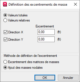 Cette boîte de dialogue permet de prendre en compte dans l'analyse sismique le déplacement des masses égal à l'excentrement ; La boîte de dialogue est accessible après un clic sur le bouton Définir excentrement dans la boîte de dialogue Paramètres de l’analyse modale.