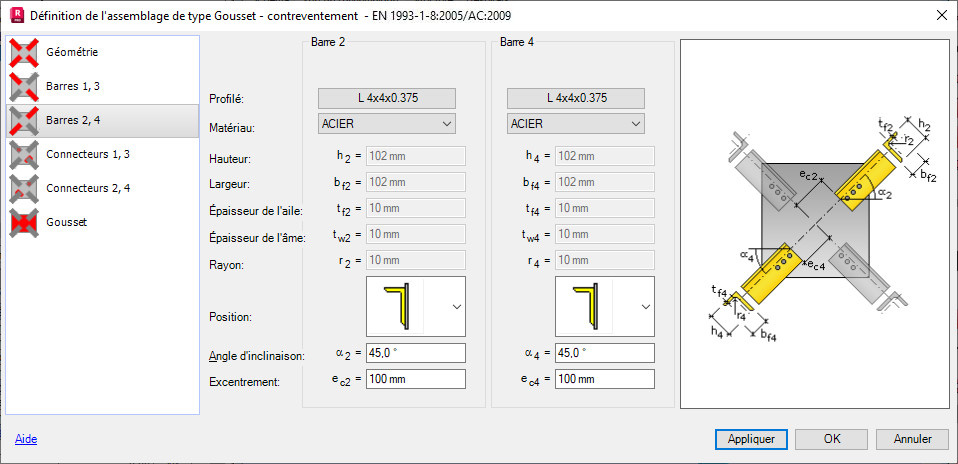 L'onglet Barres 2, 4 comprend les options permettant de définir les principaux paramètres des barres aboutissant au gousset qui se trouvent sur les lignes 2 et 4 :