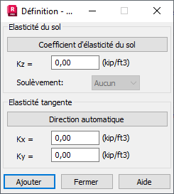 Dans la boîte de dialogue Définition -Elasticité du sol, vous pouvez définir la valeur du coefficient KZ (coefficient d'appui élastique) :
