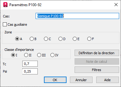 Les paramètres de l’analyse sismique des structures dépendent de la norme parasismique sélectionnée pour le calcul des structures sollicitées par des charges sismiques. Choisissez la norme sismique roumaine P100-92 dans la boîte de dialogue Définition d'un nouveau cas ou cliquez sur Paramètres dans la boîte de dialogue du type d'analyse.