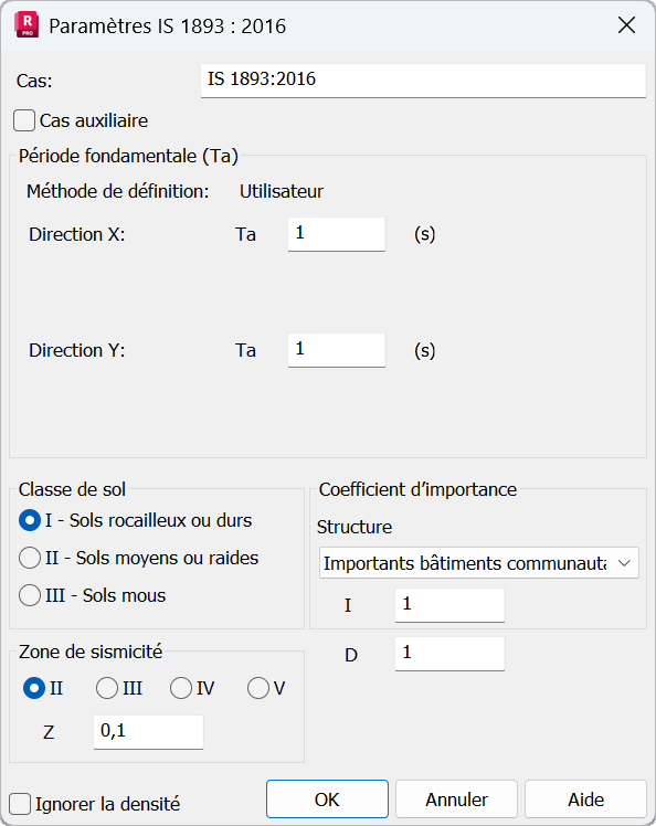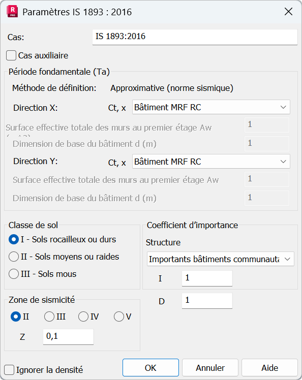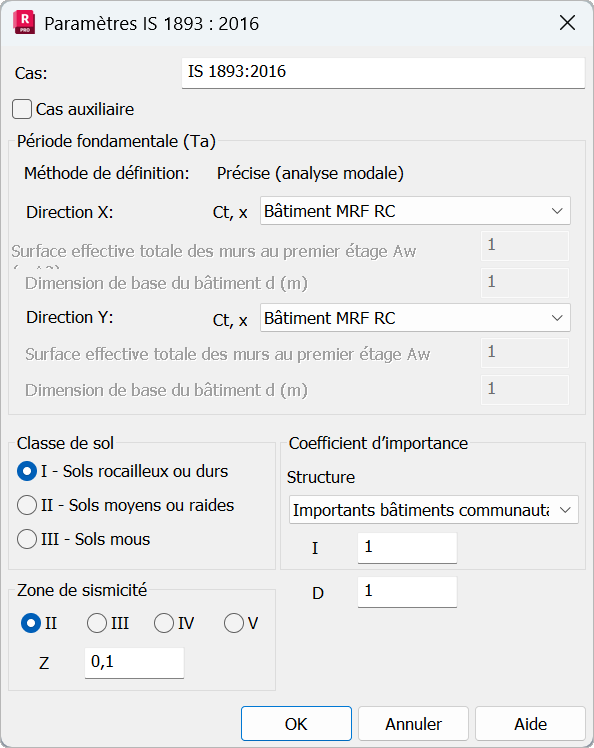 Pour effectuer l’analyse sismique selon les prescriptions de cette norme, vous devez définir les paramètres suivants :