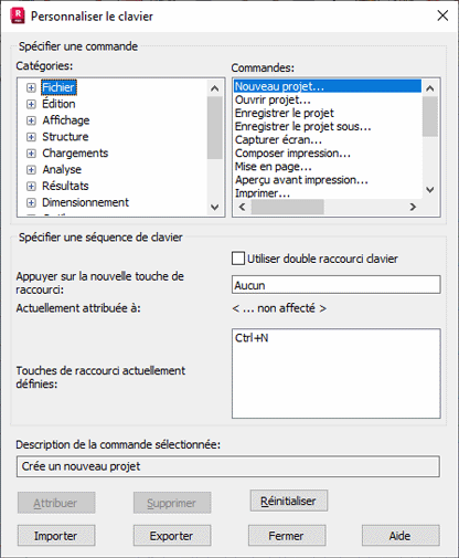 - Nouvelle touche de raccourci : permet de créer une combinaison de touches pour la commande sélectionnée.