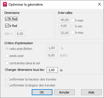 Les options disponibles dans cette boîte de dialogue permettent d’optimiser la géométrie de la poutre ou d'une semelle filante en ce qui concerne la consommation d'acier moyenne par élément. Après un clic sur le bouton Optimiser la géométrie disponible dans la boîte de dialogue Options de calcul, la boîte de dialogue représentée sur la figure ci-dessous s’affiche.