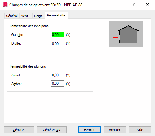 Lorsque vous ouvrez la boîte de dialogue Charges de neige et vent et cliquez sur l'onglet Perméabilité, la boîte de dialogue suivante s'affiche.