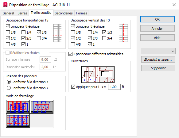 Après l’activation de la boîte de dialogue Disposition d'armature et la sélection de l’onglet Treillis soudés, la boîte de dialogue ci-dessous s’affiche à l’écran :