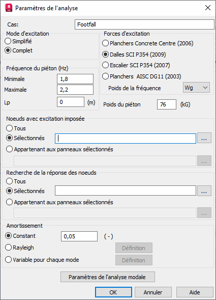 La boîte de dialogue Paramètres de l’analyse Footfall sert à définir les paramètres de l’analyse de l’excitation dynamique causée par le mouvement des piétons pour le cas de charge défini pour la structure.