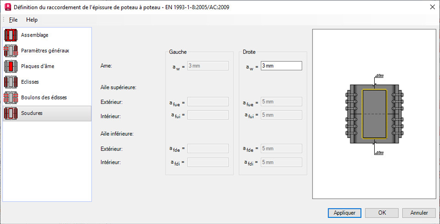 Utilisez le groupe de fonctions Soudures pour définir l'épaisseur des soudures raccordant les plaques aux barres.