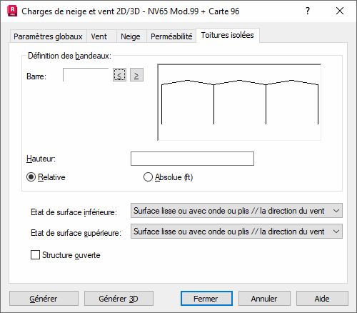 - Etat de surface inférieure et supérieure des voiles de l’enrobage. Cette information sert à calculer l'effort axial provoqué par le frottement de la toiture pour les cas de vent avant/arrière et arrière/avant.