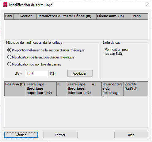 Cliquez sur Changement d'armature dans la boîte de dialogue Calcul de barre BA : Rapport pour ouvrir la boîte de dialogue Changement de l'armature. Ceci autorise la correction semi-automatique de l'armature calculée dans les éléments pour lesquels la flèche admissible a été dépassée.