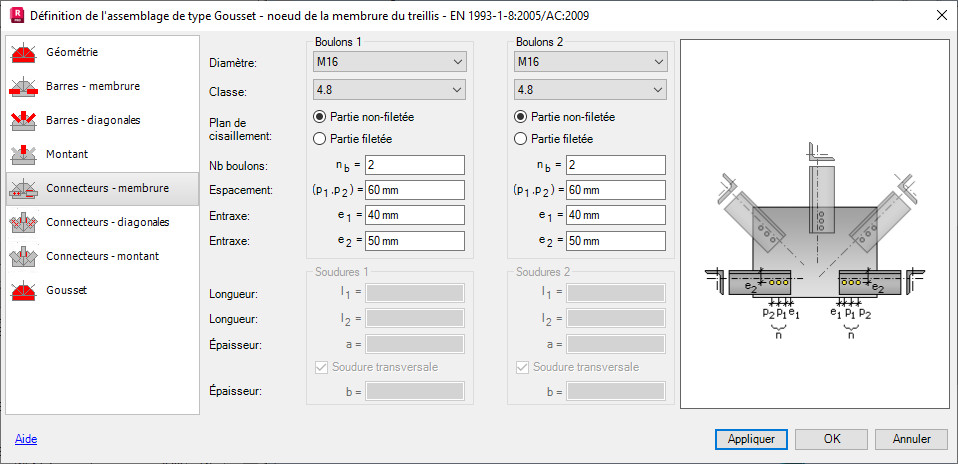 - Les paramètres des soudures utilisées pour assembler une barre au gousset (si l'assemblage soudé a été choisi).