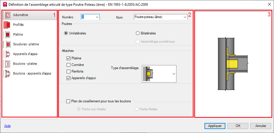 - La partie droite contient la vue graphique de l'élément de l'assemblage poutre-poteau défini.