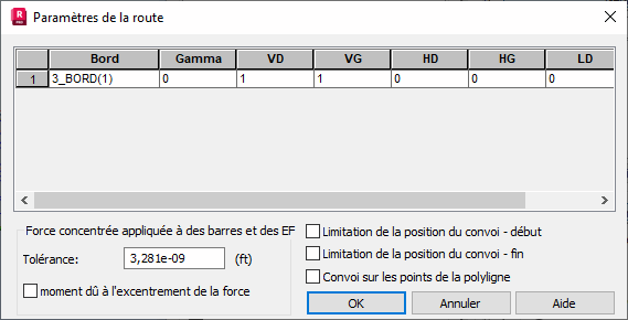 La partie inférieure de la boîte de dialogue contient le champ Tolérance. C'est un paramètre affecté au cas défini de l'analyse des charges roulantes. La tolérance détermine les conditions de la génération des charges sur barres dues au convoi défini. Si l’option Moment dû à l’excentrement de la force est cochée, une charge de moment concentrée provenant d’une force concentrée est générée et appliquée à la barre en prenant en compte l’excentrement.