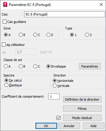 Les paramètres de l’analyse sismique des structures dépendent de la norme parasismique sélectionnée pour le calcul des structures sollicitées par des charges sismiques. Sélectionnez la norme EC 8 – Portugal (exigences européennes adoptées pour la norme Eurocode 8) dans la boîte de dialogue Définition d’un nouveau cas ou cliquez sur Paramètres dans la boîte de dialogue Type d'analyse.