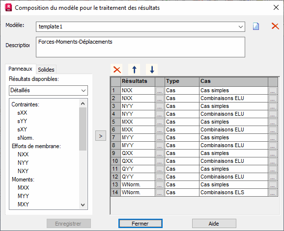 - La colonne Type permet de déterminer les types de résultats (efforts, moments, contraintes, déplacements, etc.) à traiter.