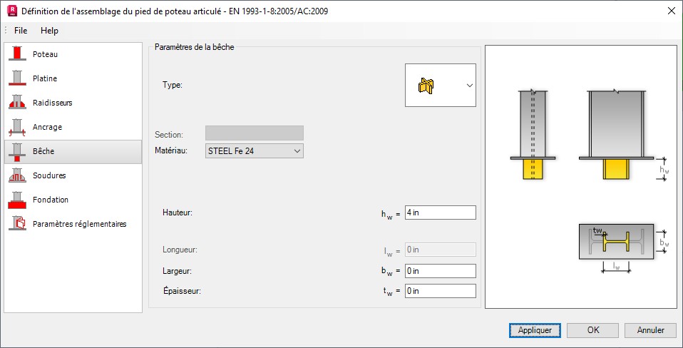 Les options disponibles sur l'onglet Bêche permettent de définir les paramètres de la bêche renforçant l'assemblage en cisaillement.