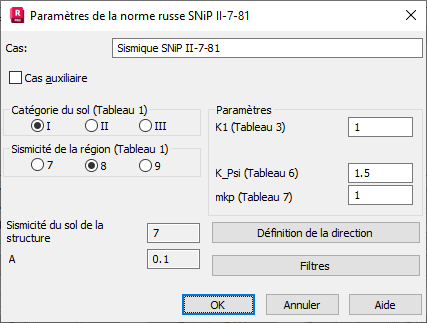 Les paramètres de l’analyse sismique des structures dépendent de la norme parasismique sélectionnée pour le calcul des structures sollicitées par des charges sismiques. Sélectionnez la norme sismique russe (SNiP II 7-81) dans la boîte de dialogueDéfinition d’un nouveau cas, puis cliquez sur Paramètres dans la boîte de dialogue Type d'analyse.