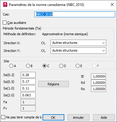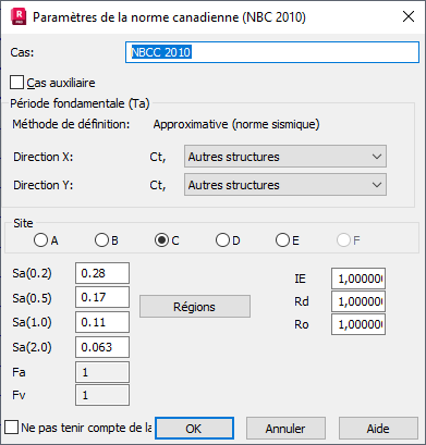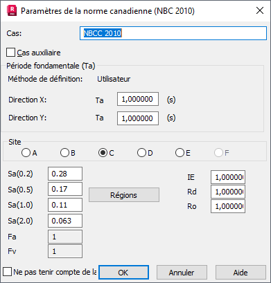 Les coefficients (Sa (0,2), Sa(0,5), Sa(1,0), Sa(2,0), Fa et Fv) dépendent de la province sélectionnée et sont conformes au Tableau C-2.