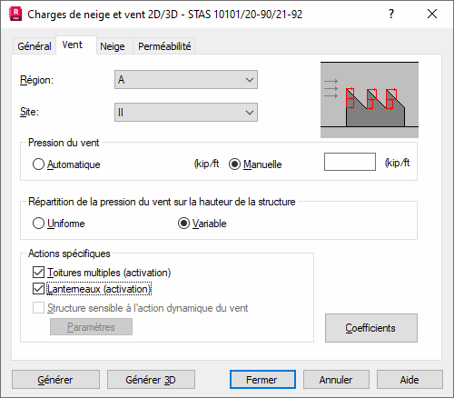 Après l'ouverture de la boîte de dialogue Charge de neige et vent et un clic sur l'onglet Vent, la boîte de dialogue suivante s'affiche.