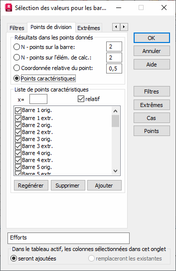 - Ajouter : ajoute des points sur la longueur de la barre pour lesquels les grandeurs indiquées seront présentées dans le tableau.