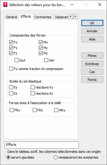 - Fy, Fz : ajoute au tableau des colonnes supplémentaires dans lesquelles seront présentés les efforts tranchants Fy ou Fz respectivement, calculés lors de l’analyse de la structure (les valeurs des efforts sont données pour le repère local d’une barre).