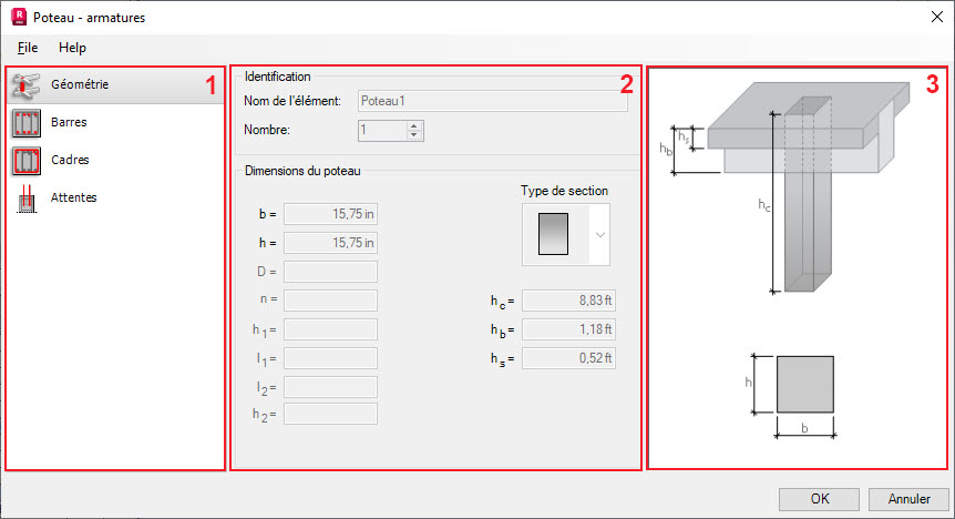 - A droite s'affiche une vue graphique du poteau BA défini et de son armature.