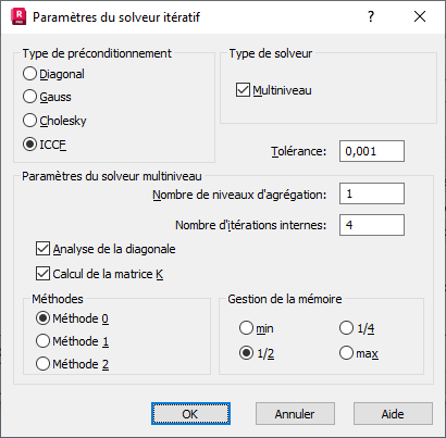 Méthode 2 : solveur multiniveau utilisant le lissage à chaque niveau d’agrégation. Sa convergence est la meilleure et elle permet d’obtenir le plus grand nombre de niveaux d’agrégation. Les exigences relatives à l’espace disque sont le moins importantes dans ce cas. Il est conseillé d’utiliser cette méthode si le nombre de niveaux d’agrégation est supérieur à 2.