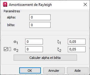 La matrice de l'amortissement C est calculée en tant que combinaison de la matrice de rigidité K et de la matrice des masses M avec prise en compte des paramètres énumérés :