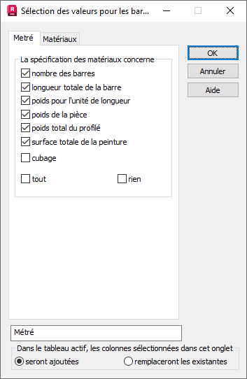 - Longueur totale de la barre : ajoute une colonne pour toute la longueur de barre. Dans la partie inférieure du tableau s’affiche la longueur totale des barres composées de la section donnée.